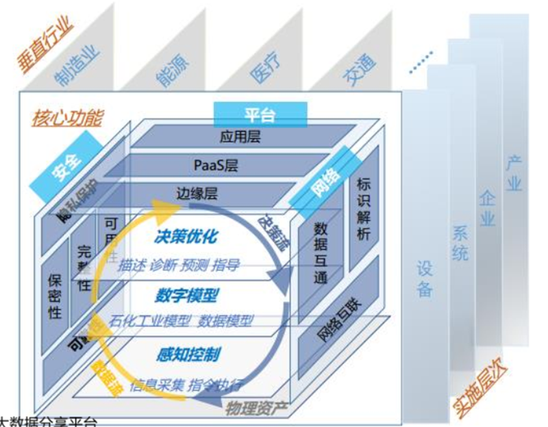 工业互联网:基于网络、平台、安全三大体系 。通过网络、平台、安全三大功能体系构建,工业互联网全面打通设备资产、生产系统、管理系统和供应链条,基于数据整合与分析实现 IT与OT的融合和三大体系的贯通。工业互联网以数据为核心,数据功能体系主要包含感知控制、数字模型、决策优化三个基本层次,以及一个由自下而上的信息流和自上而下的决策流构成的工业数字化应用优化闭环。