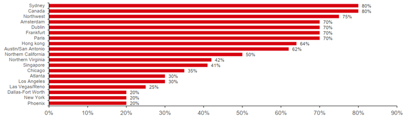 ▲全球部分主要地区数据中心云业务需求占比(2018)