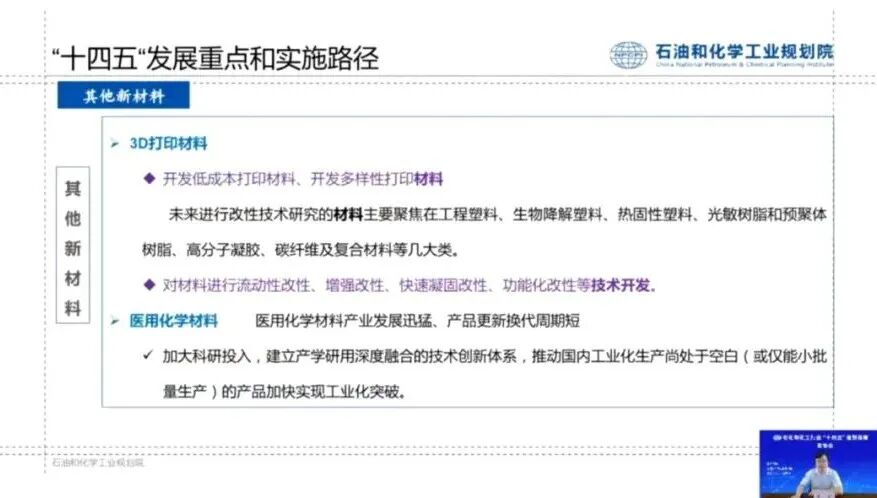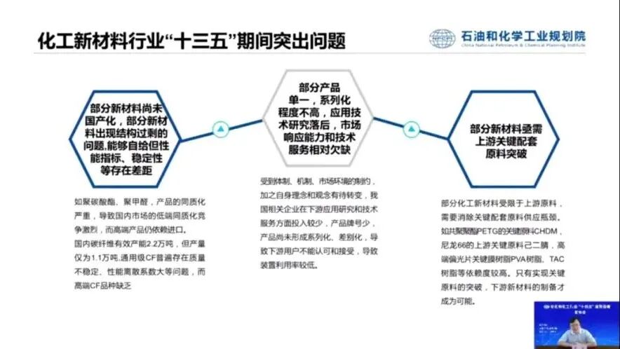 化工新材料是指通过化学合成的手段生产的新材料,以及部分以化学合成的化工新材料为基础通过二次加工生产的复合材料。作为我国《国家中长期科学和技术发展规划纲要(2006━2020年)》中重点关注的基础原材料,化工新材料目前正受到越来越多的重视。在昨日召开的“石化和化工行业‘十四五’规划指南发布会”上,石油和化学工业规划院李岩详细介绍了我国化工新材料行业”十三五“期间突出存在的问题,以及化工新材料行业”十四五“发展重点和实施路径等。