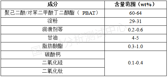 结合红外,索提,ICP,GC-MS,高温煅烧,TGA等综合分析可知,本例中采购的市场可降解塑料袋配方成分如下: