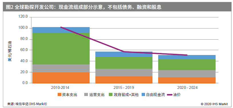 假设成本上涨得到控制,价格上涨将改善财务业绩。但这也可能会给大型石油消费市场带来更大压力,迫使其放弃石油,加速能源转型。价格上涨的好处也会由石油公司和东道国政府共享。例如,2010-2014年,当布伦特原油年均价接近或超过100美元/桶时,“政府留成及其他” ³收入约占到每桶收入的55%。但在2014年油价崩盘后,政府留成份额下降,2016年跌至36%。