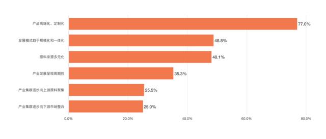 产品高端化、发展模式一体化和原料来源多样化是化工行业发展升级的重要方向。(见图9)要解决当前中国石化行业发展面临的困难,进一步提升国际竞争力,解决技术钳制的安全性问题,首要方向是加大创新力度,提升新产品开发能力,进一步提升产品附加值。77.0%的受访者认为石化产品需要往高端化和定制化方向发展。其次,有近一半(48.8%)的受访者认为石化行业发展模式需要趋于规模化和一体化,要更加充分地利用我国石化行业规模大的优势,进一步加强整合,提升协作发展的效益。列在第三位的是促进原料来源多样化,我国石化行业仍有不少原料来源严重受制于人,特别是在部分高端化工产品的供应来源上,过于集中在少数发达国家,这不仅使其他国家掌握了更大的市场话语权,增加了进口成本,更重要的是使石化行业的供应链安全受到了一定的威胁,特别是在今年全球疫情的冲击下,部分原料来源过于集中,使相关产品面临断供的风险,因此,需要进一步拓展产品供应来源,提高石化产业发展的安全性。