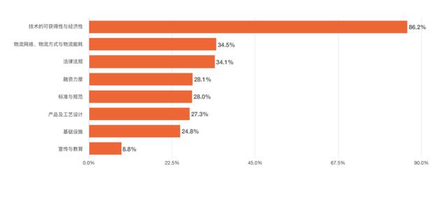通过发展循环经济提升石化行业效益是重要的发展方向。发展循环经济可以节约资源,减少污染物排放,促进化工能源资源的高效利用,促进多产业链协调一体化发展。循环经济发展是经济发展进入更高层次的必然趋势,我国的循环经济体系正在逐步建立,日益完善,在动力电池回收、塑料回收、汽车拆解、垃圾发电、电子产品回收等多行业、多产业链中都在逐步形成绿色循环体系。(见图11)受访者普遍认为(86.2%),技术的可获得性和经济性不断提升,将有力地推动循环经济的发展。另外,社会对物流方式和物流能耗更加关注、法律法规对资源环境节约型发展模式更加支持、相关的标准规范更加完善,以及社会对循环经济的融资支持、产品和工艺设计能力不断提升等多方面因素,都为进一步推动循环经济发展提供了更好的外部环境,也成为石化行业转型升级的重要方向。
