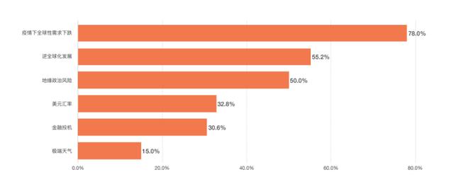 影响2020年原油价格走势的主要是全球需求、逆全球化趋势和地缘政治风险。(见图2)高达78.0%的受访者认为全球性需求下跌是首要因素,全球经济强劲,对原油的需求增长快,就会推动原油价格提升,而如果全球经济低迷,会导致原油需求下降、价格走低。随着新冠肺炎疫情在全球蔓延,经济活动几乎停滞,需求垂直性下滑。第二大重要的因素是逆全球化趋势的发展(55.2%),逆全球化趋势从两个方面影响原油价格走势,一方面逆全球化导致全球贸易萎缩,经济受损,影响对原油的需求;另一方面,逆全球化和贸易保护主义也可能改变全球原油的供给格局。而疫情更进一步加速了逆全球化的趋势。地缘政治风险是2020年影响国际原油价格的第三大因素,这与近年来国际形势,特别是中东形势较为不稳定有关。2019年,美国宣布退出2015年伊核问题六国达成的核协议,并重新对伊朗实施制裁,此后美国和伊朗关系陷入紧张状态,并给全球原油供应蒙上了阴影,成为最大的地缘政治风险。除此之外,有32.8%的人认为美元汇率(美联储QE)走势影响石油价格,美元汇率走势多数时候与原油价格走势是一种反向变动关系,也就是说如果美元贬值,而油价是用美元作为计价单位,那么油价便会随之上涨,反则反之。最后,30.6%和15.0%的受访者认为金融投机和极端天气等突发事件也将影响国际原油价格走势。