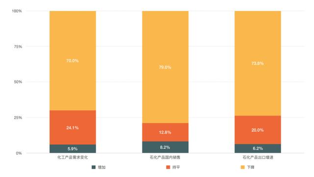 2020年中国能源化工产品的需求增长承压很大。(见图3)受疫情影响,近70%的受访者不认为今年中国需求将有所上升,24.1%的认为将与上年保持稳定,只有5.9%的受访者认为需求将有所增长。从国内外市场比较看,我们认为化工产品需求增长的动力主要来自于国外,但由于国际经济受疫情影响较大,受访者认为将会对国内能源化工进行传导性影响。有79.0%的受访者认为2020年国内石化产品的销售额将不会增长,有12.8%的人认为会与上年持平,只有8.2%的比重认为国内销售额会增长,持悲观态度的比重超出持乐观态度的比重约70.8个百分点。受访者对石化产品出口的态度同样悲观,73.8%的受访者都认为出口增速将下降,约20%的受访者认为石化产品的出口增速与上年大致持平,认为出口增速将会上升的仅有6.2%。