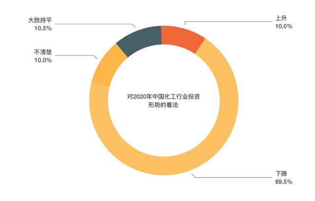 受疫情影响,中国石化产业正面临下游需求全面下滑的局面,石化行业的投资预计将不会持续增长,很多受访企业表示目前不宜大规模投资。受访者中有10.5%的人认为石化行业投资将与上年大致持平,有10%的人认为投资将比上年增加,比认为投资将下降的(69.5%)比重少59个百分点。(见图5)