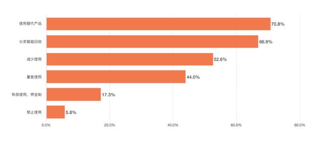 塑料废弃物污染问题是化工行业绿色可持续发展的一大挑战。石化产品的发展使用在带来极大社会便利和促进各行业发展的同时,也带来了一定的副作用。塑料废弃物属于消费后端资源的一种,近几年数据显示,国内每年产生废塑料达3500万吨,仅14%用于回收利用。由于不易分解而严重影响和污染环境,以及一次性塑料制品对资源的浪费,引发社会对化工产品环保治理、回收利用的讨论和关注。随着我国经济社会发展进入新的阶段,解决塑料产品对环境的污染成为重要的议题,也是促进行业转型升级的重要动力。对于如何应对塑料废弃物污染问题,70.8%的受访者认为应该发展和使用替代产品,66.9%的受访者认为应该促进分类智能回收,52.6%的认为应该减少使用,还有44.0%的受访者认为应该促进重复使用。(见图8)总体来看,发展更好的产品进行替代,减少污染产品使用或促进循环利用是重要方向,这无疑要求塑料行业尽快适应社会需求变化,加快转型升级的步伐。