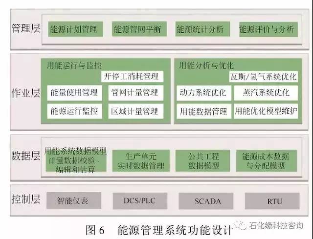 用能系统管理与优化目标:实现能源计划、运行、统计分析、评价、能源优化的全流程管理;实现企业用能设备与公用工程(蒸汽、燃料和动力系统)系统的实时数据采集与监控,并进行用能效率、成本、能量平衡的分析;建立生产厂蒸汽、燃料和动力系统优化模型,实现能源产、输、转、存、耗、销整个过程的管理与优化。具备能源计划管理、能源官网平衡、能源统计分析、能源运行与监控、用能分析与优化、能源数据收集等功能(如图6所示)。