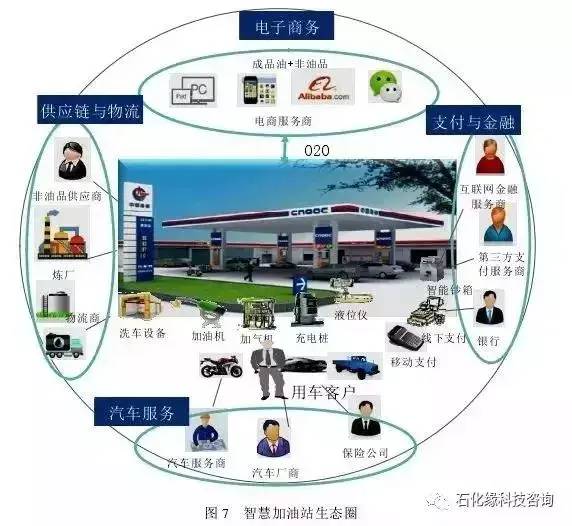 以“人·车·服务”的运营思路,借鉴互联网思维,依托供应链与物流、汽车服务、支付与金融以及电商服务与加油站服务的集成,构建智慧加油站生态服务圈,实现加油站业务的全面转型升级(图 7)。