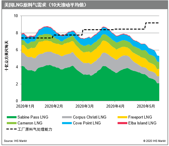 埃信华迈(IHS Markit)的数据显示,输送到美国天然气液化厂的原料气已从3月下旬的每天95亿立方英尺锐减至五月中旬的每天60亿立方英尺。