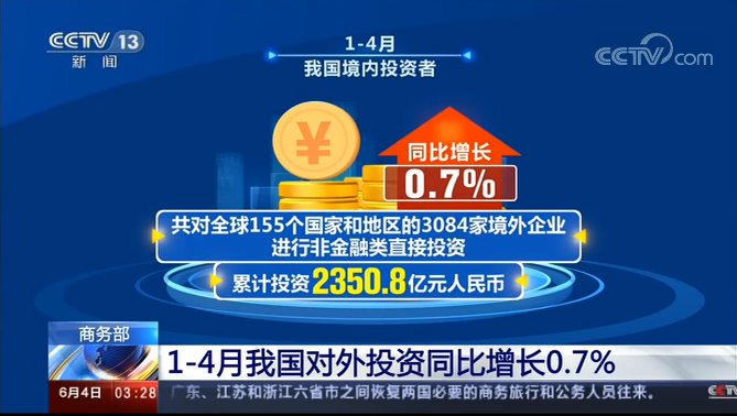 数据显示,今年前4个月,中国境内投资者共对全球155个国家和地区的3084家境外企业进行了非金融类直接投资,累计投资2350.8亿元人民币,同比增长0.7%;