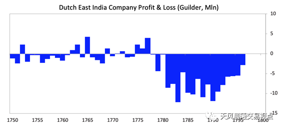 如下图所示,荷兰东印度公司实际上是具有经济和军事力量的公司,它在1780年开始承受损失,在第四次英荷战争期间损失惨重。