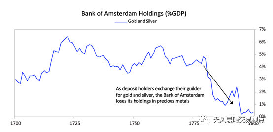 下图显示了荷兰盾与英镑/黄金之间的汇率;显然,该银行不再具有任何信誉,并且该货币不再是储藏财富的良好手段,投资者便逃向其他资产和货币。