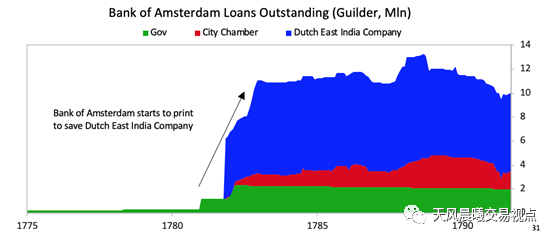 因为荷兰东印度公司对经济具有重要意义,而且其在荷兰金融体系尚有未偿还债务,因此它太重要了,不能倒闭,阿姆斯特丹银行别无选择,只能开始“借出”大量新发的荷兰盾给公司。在战争期间,政策制定者还利用银行给政府放贷。 下图显示了在第四次英荷战争期间,银行资产负债表上的贷款激增(注:战争开始时大约有2000万荷兰盾未偿还)。