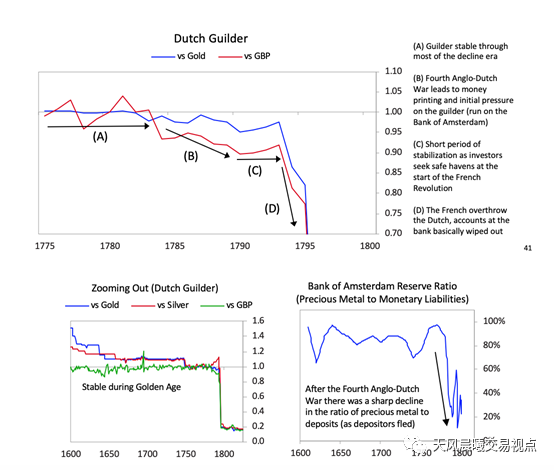 利率上升,且阿姆斯特丹银行不得不使货币贬值,这降低了其货币具有储藏价值的可信度。在危机的这一刻,该银行多年来发行的硬通货“纸币”数量远远超过了能够兑现的数量,这导致了经典的阿姆斯特丹银行的挤兑,从而导致了荷兰盾的崩溃。最后英镑取代荷兰盾,成为主要的储备货币。
