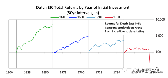 下图显示了从不同年份开始投资者持有荷兰东印度公司股票的回报。与大多数泡沫公司一样,它开始时运作良好,拥有不错的基本面,即使当基本面开始变差,也还是吸引了很多的投资者,但是它负债开始不断增加,直到恶化的基本面和过重的债务负担使公司破产。