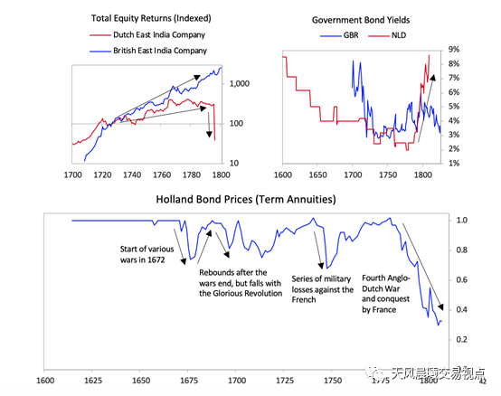 注:下方图表展示了荷兰国债价格走势,1672年由几次战争引发价格下跌,随后1675年在战争结束后价格恢复,但陷入光荣革命再次引发下跌,1725年-1750年间由于一系列的对法战争中的失利引起价格大幅下跌,最后一轮的下跌发生在第四次英荷战争以及被法国侵略时期。