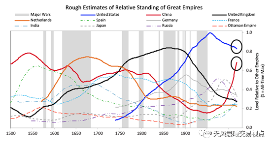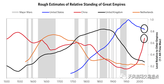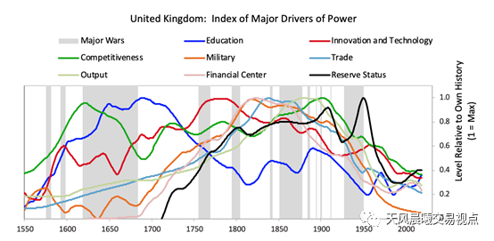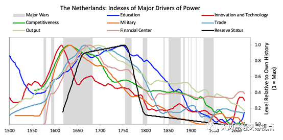 下图来自第1章,大国的实力曲线是通过八项实力指标——教育、创新和技术、竞争力、军事、贸易、产出、金融中心和储备地位——来合成的。下图显示了这些实力指标平均水平的曲线,其中最近的三个储备国家(美国、英国和荷兰)贡献了的大部分权重。