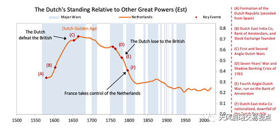 在1500至1600年期间,西班牙帝国是“西方”世界中最杰出的经济帝国,而明朝统治下的中华帝国是“东方”世界中最强大的帝国,甚至比西班牙帝国更强大(见图2中的绿色虚线和红色实线)。西班牙人通过在世界各地夺取船只和军事力量来获得财富,他们夺取了大片地区的控制权(占地球陆地面积的13%),并夺取了贵重的东西,其中,最重要的就是金银,金银是当时的货币。正如大帝国相对地位的图表(图3)中橙色线所示,随着西班牙权力的减弱,荷兰人获得了权力。当时西班牙控制了我们现在称之为荷兰的小区域。当荷兰人在1581年变得足够强大时,他们推翻了西班牙人,然后从1625年左右到1780年,他们超过西班牙和中国成为世界上最富有的帝国。荷兰帝国在1650年左右达到巅峰,当时被称为荷兰黄金时代。这一时期是伟大的全球化时期之一,因为可以乘船去世界上繁荣的各地获取财富。荷兰人拥有强大的造船业和经济体制,在使用船只、金钱奖赏和军事力量方面领先他人,这让他们建立了帝国。荷兰(正如我们现在所叫的)在大约100年里保持了最强的力量。为什么会这样?