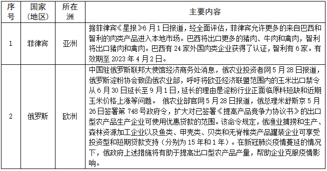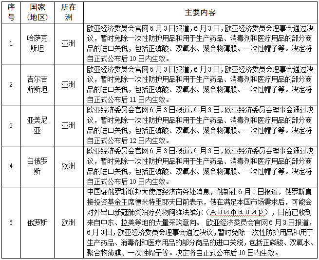 对医疗物资贸易采取措施的情况——截至6月8日,共有81个国家(地区)采取了相关措施。本期更新5个国家,俄罗斯可能对外出口新冠肺炎治疗药物阿维法维尔;欧亚经济委员会理事会6月3日通过决议,暂时免除一次性防护用品和用于生产药品、消毒剂和医疗用品的部分商品的进口关税。具体如下: