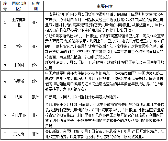 对边境口岸采取措施的情况——截至6月8日,共有104个国家(地区)采取了相关措施。本期更新7个国家,其中伊朗、比利时、俄罗斯、法国、利比里亚、突尼斯开放边境口岸。具体如下: