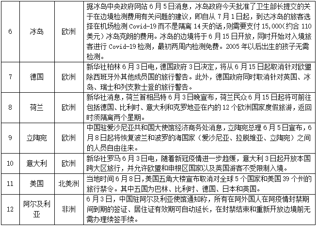 对人员入境采取措施的情况——截至6月8日,共有178个国家(地区)采取了相关措施。本期更新12个国家,其中日本、斯里兰卡、荷兰、立陶宛、意大利、美国允许部分外国人入境;奥地利对部分国家入境人员免除隔离或检测;德国取消对部分国家的旅行警告;阿尔及利亚签证到期自动延长。具体如下: