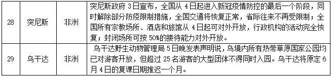 宣布进入紧急状态等情况的国家(地区)——截至6月8日,共有154个国家(地区)采取了相关措施。本期更新29个国家(地区),其中吉尔吉斯斯坦、马来西亚、泰国、新加坡、爱尔兰、比利时、俄罗斯、拉脱维亚、英国、美国、阿尔及利亚、刚果(金)、喀麦隆、利比里亚、坦桑尼亚、突尼斯、乌干达17个国家放松部分管制措施,启动不同程度的复工复产复课;立陶宛、西班牙、新西兰紧急状态降级。具体情况如下: