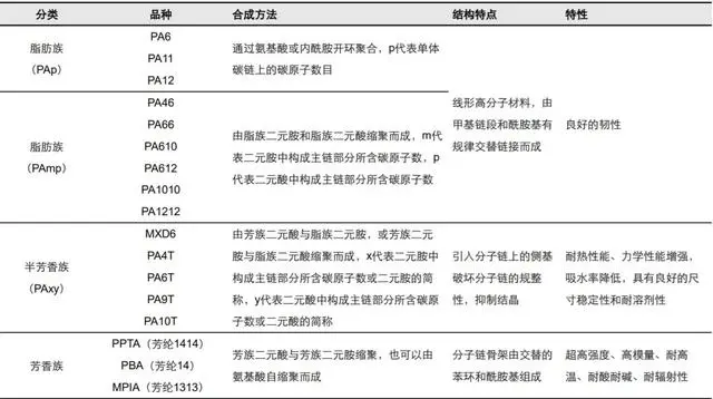 △聚酰胺的分类及特点。来源:中纺学产业研究院,《半芳香族尼龙的结构性能及其应用》,长江证券研究所