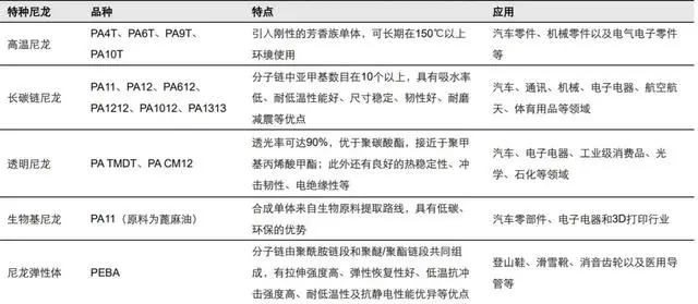 相较常规品种,引入新的合成单体的特种尼龙具备更为优异的性能。常规尼龙(PA6、PA66 等)即使在经增强、阻燃等改性后,仍存在诸如强亲水性、不耐高温、透明性差等缺点,在一定程度上限制了其应用范围。因此,为了改善常规尼龙的缺点,增加新的特性,一般通过引入新的合成单体,可以得到一系列不同性能的特种尼龙,以适应更多的使用场景。这些特种尼龙包括高温尼龙、长碳链尼龙、透明尼龙、生物基尼龙以及尼龙弹性体等诸多品种。