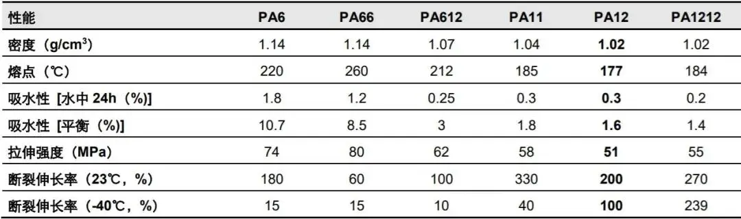 △尼龙的性能比较。资料来源:《尼龙 12 的开发与应用》,立悦化工,长江证券研究所