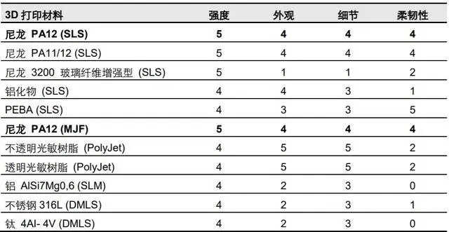 △3D 打印材料性能比较(以 5 分为满分)。资料来源:Sculpteo 官网,长江证券研究所