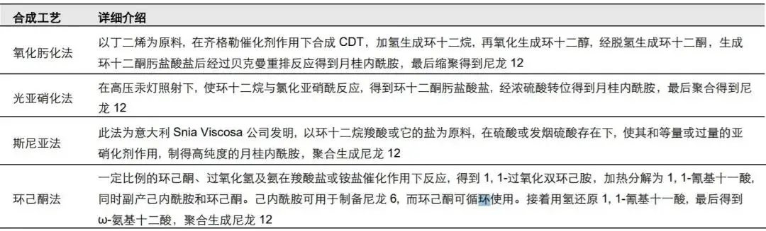 尼龙 12 主流生产工艺为氧化肟化法,技术壁垒较高。尼龙 12 通常采用丁二烯为原料,由环十二碳三烯(CDT)和月桂内酰胺开环缩聚制得,工艺包括氧化肟化法、光亚硝化法和斯尼亚法,其中氧化肟化法是主流工艺。氧化肟化法生产尼龙 12 需经三聚、催化加氢、氧化、酮化、肟化、贝克曼重排、开环聚合等 7 个步骤, 且整个过程中要使用苯、发烟硫酸等有毒、腐蚀性较大的原料, 开环聚合温度需 270-300℃, 生产步骤操作难度较大。目前以赢创公司为代表的大部分生厂商都使用以丁二烯为原料的主流工艺路线,而日本宇部兴产公司取得英国石油化学公司的技术许可后,采用以环己酮为原料的工艺路线实现了 PA12 的工业化生产。