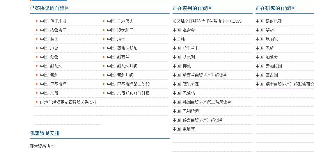 截至目前,中国已与澳大利亚、韩国、新加坡等国签订了18个FTA,也正在推动12个FTA谈判,包括与海合会、挪威、斯里兰卡、以色列、摩尔多瓦、巴拿马、巴勒斯坦的双边谈判,与新加坡、韩国的升级谈判或第二阶段谈判,以及中日韩、RCEP等多边谈判。
