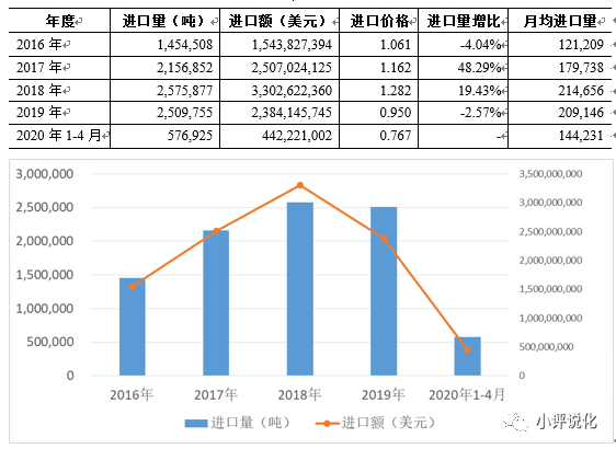 2020年4月,中国进口乙烯11.07万吨,同比去年减少52.31%(23.21万吨)。2020年1-4月中国进口乙烯57.69万吨,同比去年减少39.37%(95.16万吨)。