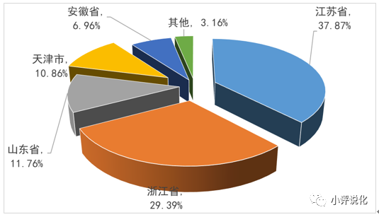 2020年4月中国进口乙烯企业所在地区前五位进口量共10.72万吨(占中国进口总量96.84%),其中江苏省进口量4.19万吨,占比37.87%;浙江省进口量3.25万吨,占比29.39%;山东省进口量1.30万吨,占比11.76%;天津市进口量1.20万吨,占比10.86%;安徽省进口量0.77万吨,占比6.96%;其他省市进口量0.35万吨,占比3.16%。