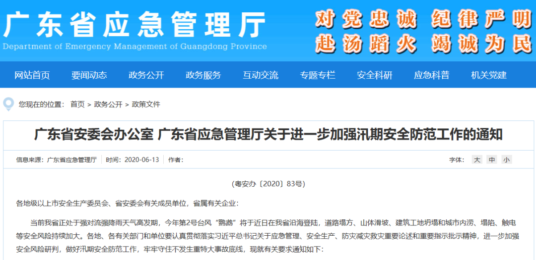 6月13日,广东省安委办、省应急管理厅就进一步加强汛期安全防范工作发出通知,要求严厉打击违法分包转包和不落实危大工程专项施工方案等行为。同时提到要结合实际,严格落实汛期安全防范措施,必要时果断停工、停产、停业、撤人。