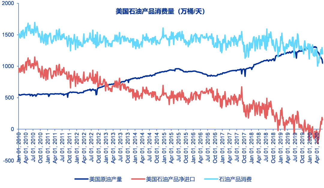 美国是全球最大的石油生产国与消费国,原油保持稳定的进口同时,随着近年来页岩产量的发展,原油的出口逐渐提升。目前美国仍然是原油的净进口国,但是美国同时出口炼油产品及成品油。考虑到下游产品的出口,美国一度成为石油产品的净出口国(原油和炼油产品总体为净出口)。由于3月份以来油价下跌导致美国的页岩减产,美国原油的出口量大幅减少,至5月15日以来,美国又重新回到石油产品的净进口国。
