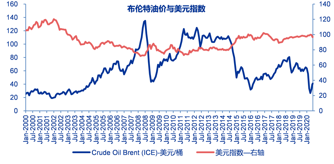 历史上油价与美元指数呈负相关性,我们认为前期油价下跌时而美元指数上涨,主要与避险资产有关。但美元指数走强有利于美国的原油进口,且油价上涨会增加市场对美元的支付需求。