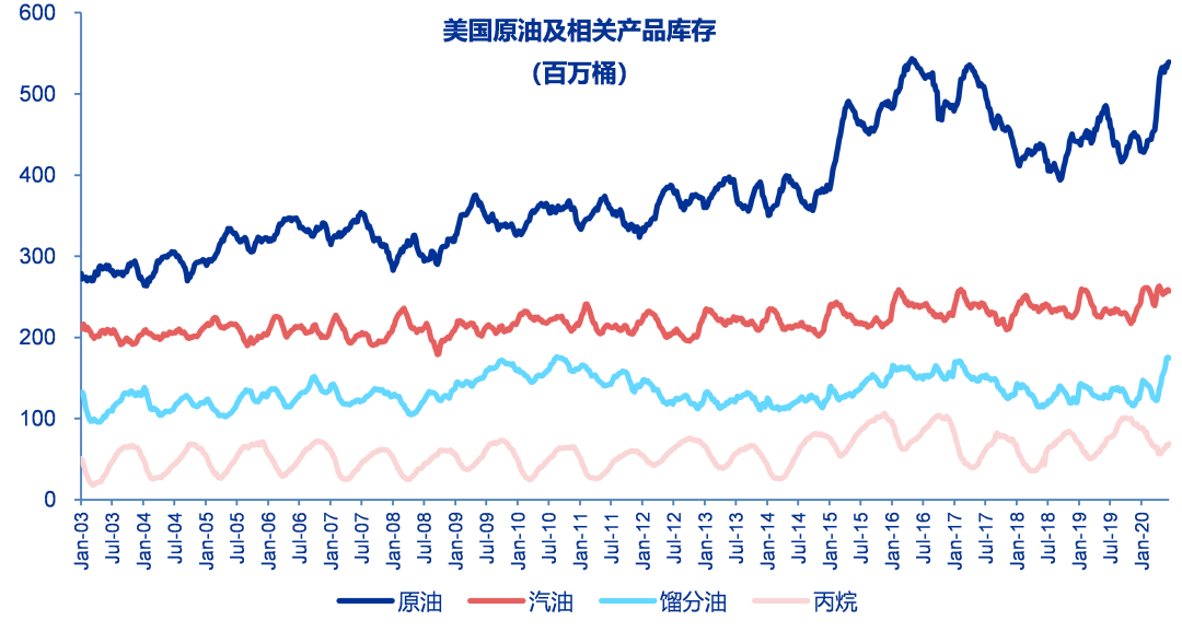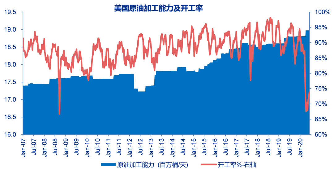 美国重回石油产品净进口国及影响。由于3月份以来油价下跌导致美国的页岩减产,美国原油的出口量大幅减少,至5月15日以来,美国又重新回到石油产品的净进口国。虽然美国页岩产量反应灵活,但是在目前油价下仍然难以出现大范围的资本开支好转,且沙特与俄罗斯目前对原油市场份额的争夺仍然没有终结。美国目前的采油钻机数较年初已经下降70%以上,即使原油价格上涨,短期产量也难以大幅回升。未来相当长的一段时间内,美国或将维持原油及石油产品的净进口,或加大对于OPEC+的原油依赖性。同时,加拿大石油减产,或使得美国炼油厂的原料成本增加,套利空间减小。在全球利率下行及流动性改善,以及美元走强因素下,中国国内的资金也明显流入大宗商品,在原油存储受限的情况下,石化等大宗商品库存居高。