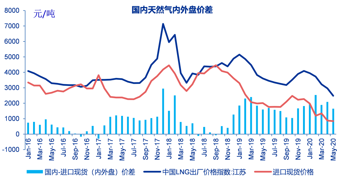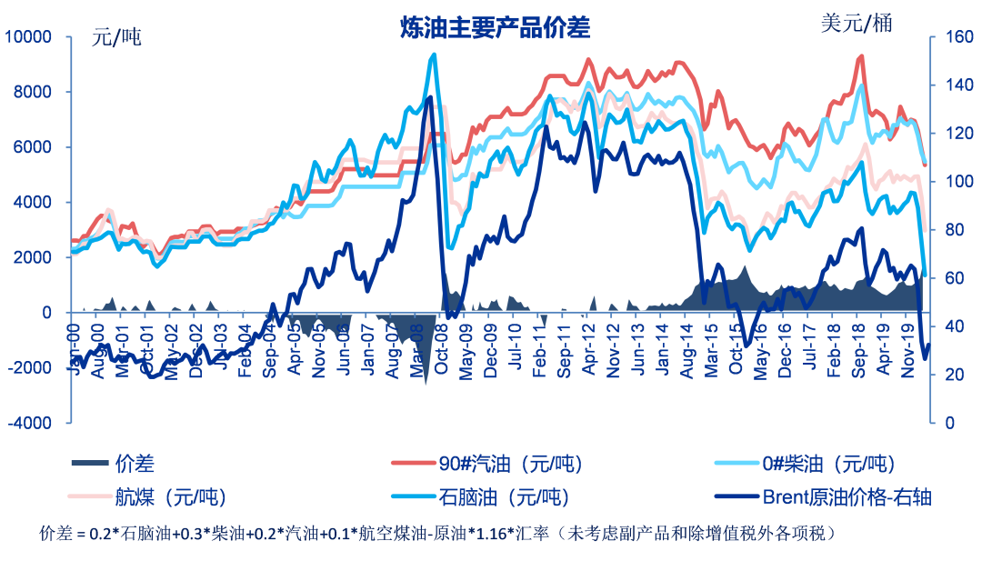 2020年5月份国内炼油下游主要产品对应原油的价差为1303元/吨,月环比下降426元/吨,同比上涨590元/吨。
