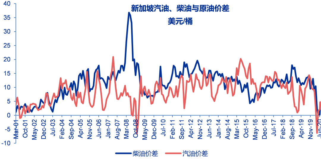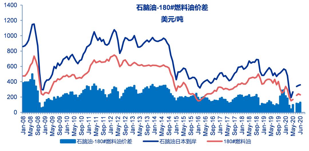 至6月19日当周石脑油与180#燃料油价差为130美元/吨,较之前一周上涨20美元/吨。