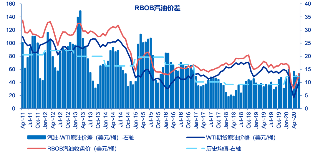 至6月19日当周美国汽油RBOB与WTI原油价差为13.25美元/桶,较之前一周上涨2.22美元/桶,历史平均为15.54美元/桶。