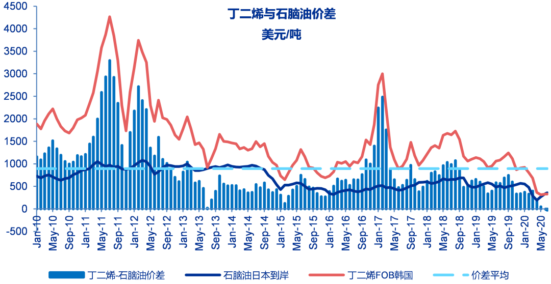 至6月19日当周丁二烯与石脑油价差为-28美元/吨,与之前一周相比下降7美元/吨,历史平均为894美元/吨。