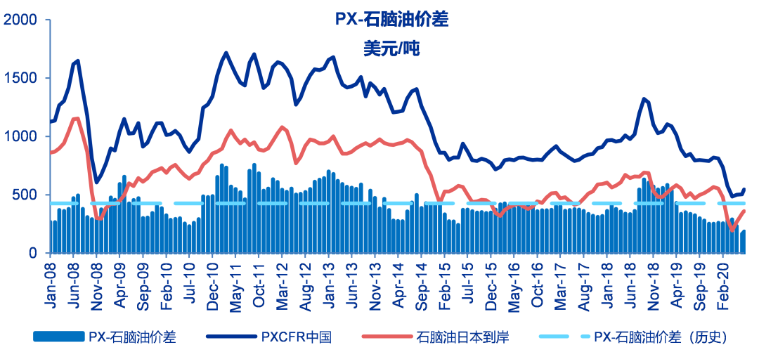 至6月19日当周PX与石脑油价差在186美元/吨,较之前一周上涨10美元/吨,价差历史平均为426美元/吨。