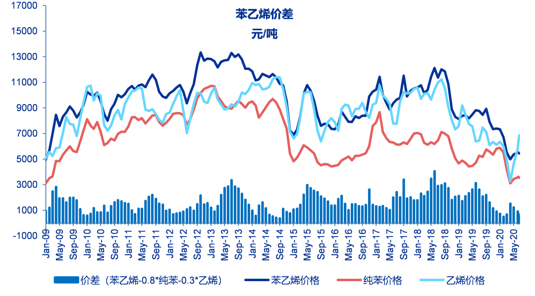 至6月19日当周苯乙烯价差为558元/吨,较之前一周下降171元/吨,历史平均为1646元/吨。