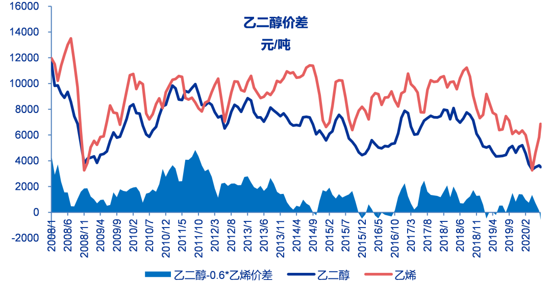 至6月19日当周乙二醇价差为-599元/吨,较之前一周下降405元/吨,历史平均为1459元/吨。