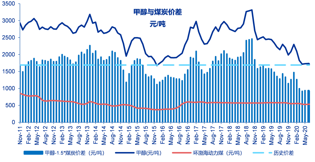 至6月19日当周甲醇与环渤海动力煤价差为915元/吨,较之前一周下降24元/吨,历史平均为1689元/吨。