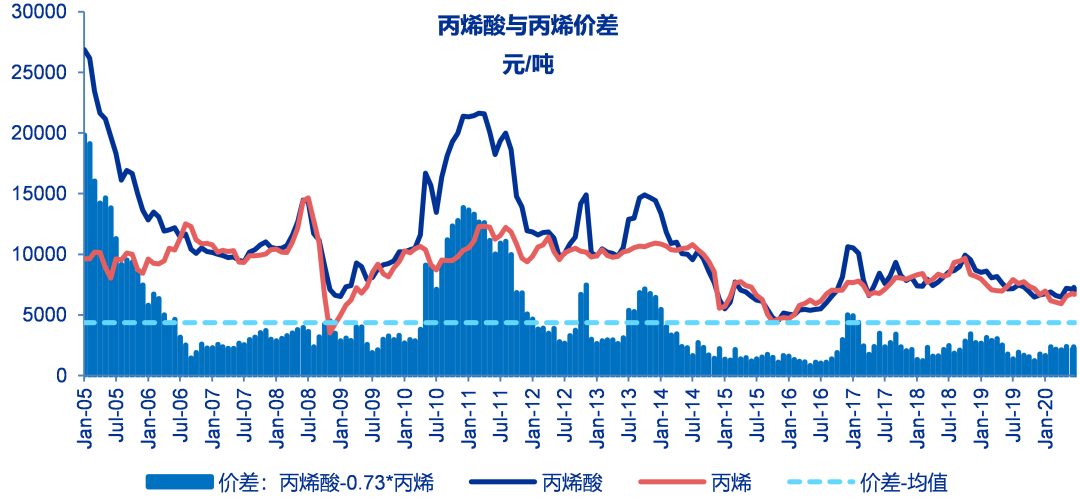 至6月19日当周丙烯酸与丙烯价差为2163元吨,较之前一周下降223元/吨,历史平均价差为4365元/吨。