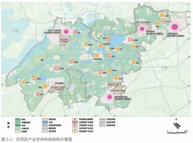 在虹桥商务区、青浦新城、吴江太湖新城、嘉善高铁新城等构建“一核引领、三综合、多点特色”的现代服务业集聚区格局;