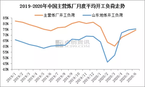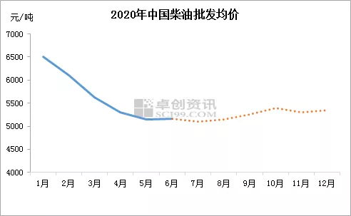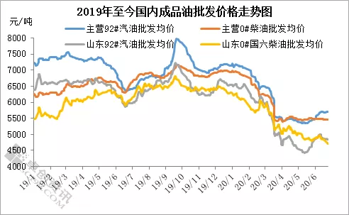 据卓创数据统计,2020年上半年,国内主营92#汽油批发均价6100元/吨,同比下跌16.40%,国内主营0#柴油批发均价为5901元/吨,同比下跌8.86%;山东地炼92#汽油批发均价为5329元/吨,同比下跌18.21%,0#柴油批发均价为5368元/吨,同比下跌10.42%。